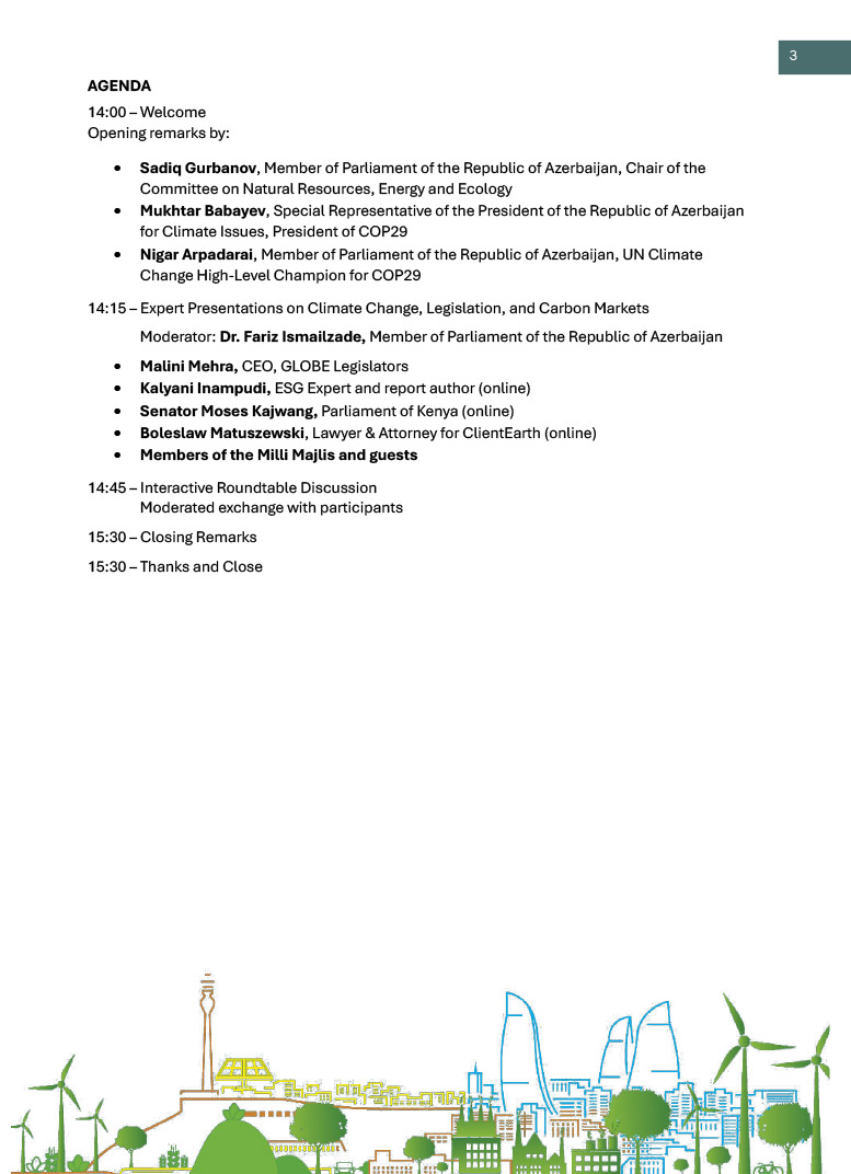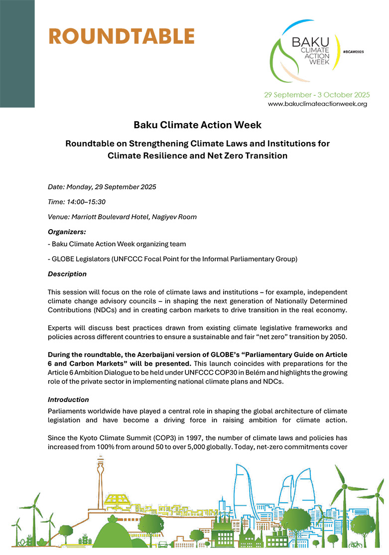 GLOBE Legislators, in collaboration with the Baku Climate Action Week organising team, is convening a Parliamentary Roundtable on 29 September, 2025, in the context of the second annual Baku Climate Action Week.