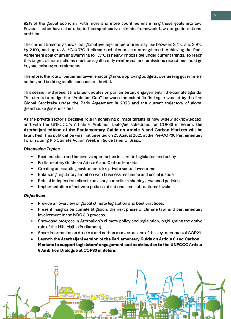 The Parliamentary Roundtable, which brings together Members of Parliament and experts, will focus on “Strengthening Climate Laws and Institutions for Climate Resilience and Net Zero Transition”. It will also see the launch of the Azerbaijani version of GLOBE’s Parliamentary Guide to Article 6 and Carbon Markets.